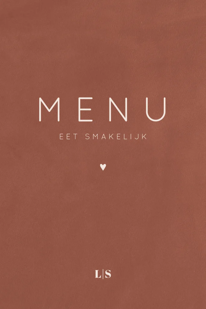 Chique trendy menukaart in roodbruine velvet-look. De tekst staat in wit, onderaan staan de initialen van het bruidspaar. De achterzijde van de kaart is in pastelbruin met roodbruine en zwarte tekst, bon appétit!