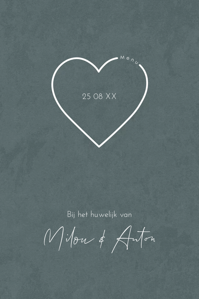 Hippe menukaart in de stijl van de trouwkaart, op een grijze velvet look achtergrond staat een hart, net als de tekst in luxe roségoudfolie. Op de witte achterzijde is ruimte voor de menugangen, de tekst staat in bijpassende kleuren en kan eenvoudig worden aangepast in de online editor, eet smakelijk!