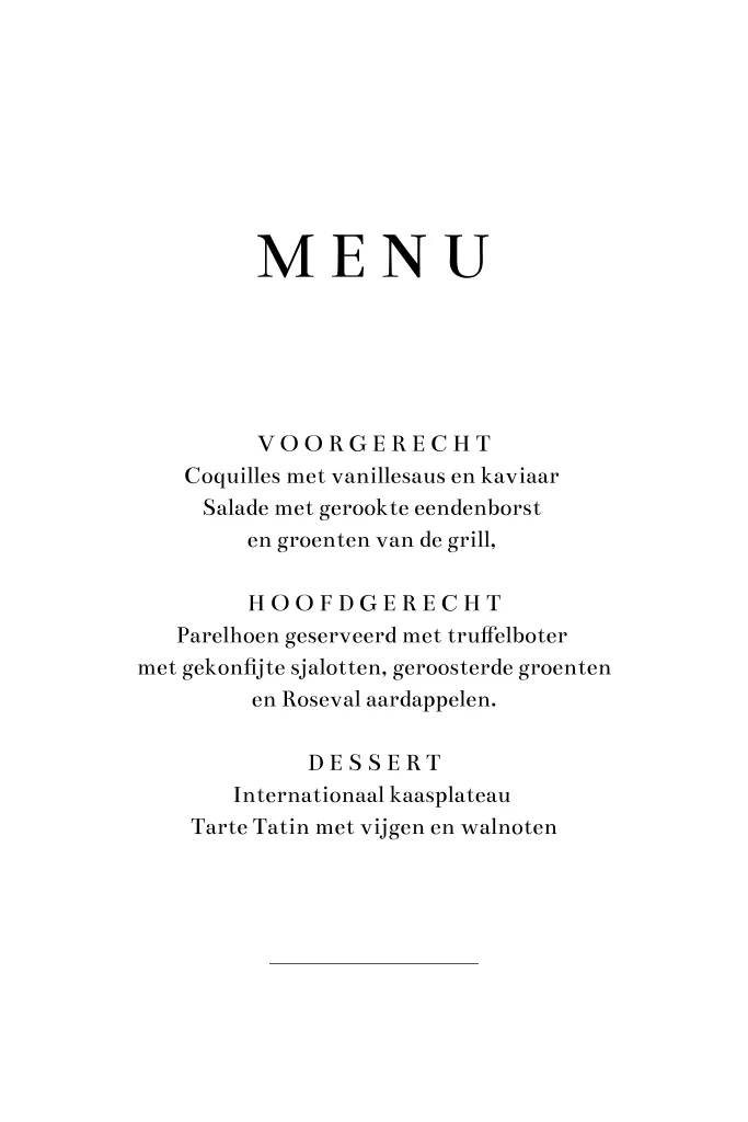 Bij deze eenvoudige menukaart gaat alle aandacht meteen naar de tekst. Dit strakke design is in zwart wit met modern lettertype, op de achterzijde staan de initialen van het bruidspaar. Pas zelf de tekst van de kaart aan in de online editor en maak de kaart persoonlijk, bon appétit!
