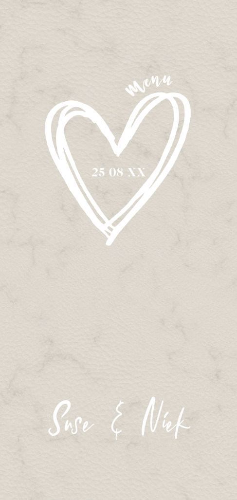 Deze stijlvolle menukaart is onderdeel van een complete trouw-huisstijl met een gemarmerde structuur-effect achtergrond en een goudfolie hart.