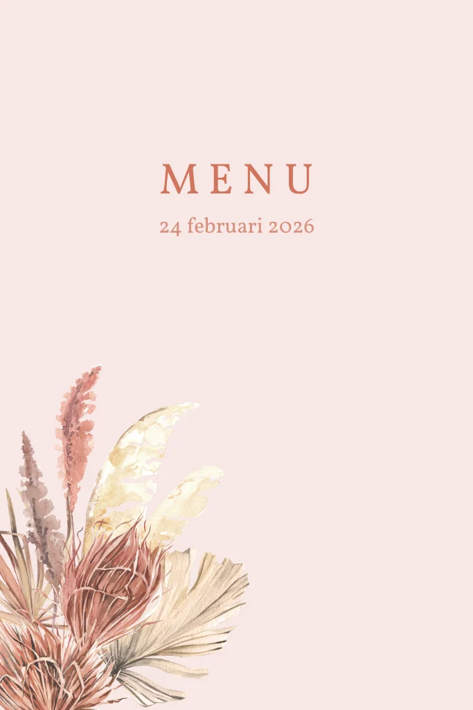 Hippe menukaart met een boeket droogbloemen in de hoek en roze letters. Kleuren en lettertypes kunnen worden aangepast naar eigen wens in de online editor.
