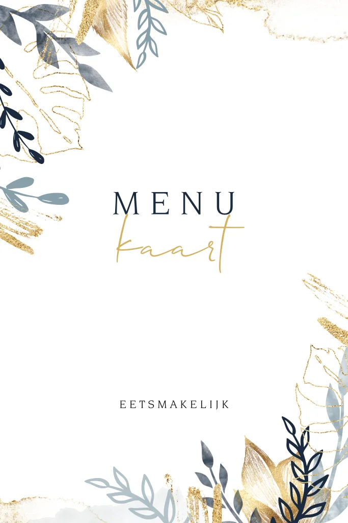 Een stijlvolle menukaart met prachtige bloemen in goud en blauw. Laat de menukaart overeenkomen met jullie trouwkaart en laat goud en blauw terugkomen op jullie speciale dag. Pas de menukaart volledig aan naar jullie eigen wensen in de online editor.