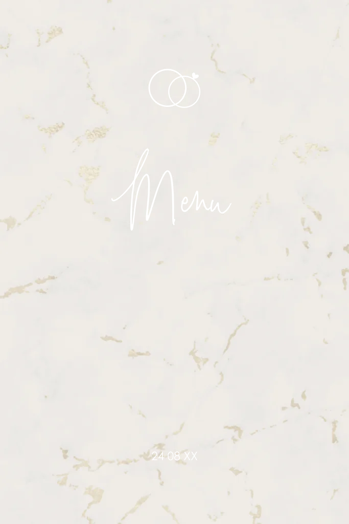 Deze mooie menukaart maakt deel uit van de huisstijl met marmerachtergrond en tekst en ringen in goudfolie. Maak er een chique huwelijksdiner van met deze stijlvolle menukaart, eetsmakelijk!