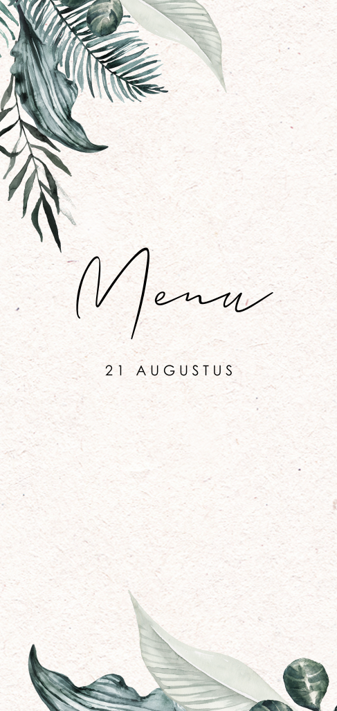 Op zoek naar een stijlvolle en unieke menukaart? Kies dan voor deze stijlvolle menukaart met handgeschilderde jungle bladeren! Deze kaart is perfect voor een avontuurlijke bruiloft en zal zeker indruk maken op jullie gasten. De natuurlijke kleuren en het trendy watercolour-design maken deze kaart helemaal af.