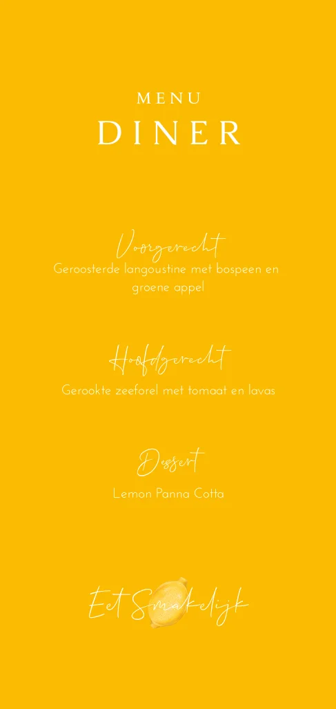 Zomerse menukaart in knalgeel, dat zorgt voor een vrolijke noot op een feestelijk gedekte tafel! Op deze langwerpige gele kaart staat de tekst in wit met verschillende lettertypes en een citroentje onderaan. De achterkant is wit met gele en zwarte tekst, hier komt het design van de citroen weer terug tussen de verschillende gangen.