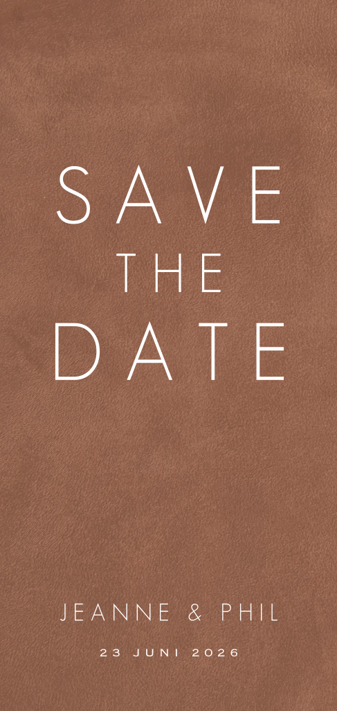 Minimalistisch maar chique, deze save the date kaart! Een langwerpige kaart in bruine velvetlook, daar komen de hippe letters in roségoudfolie mooi op uit. De achterkant van de kaart is wit, pas de tekst eenvoudig zelf aan in de online editor en bestel een proefdruk.