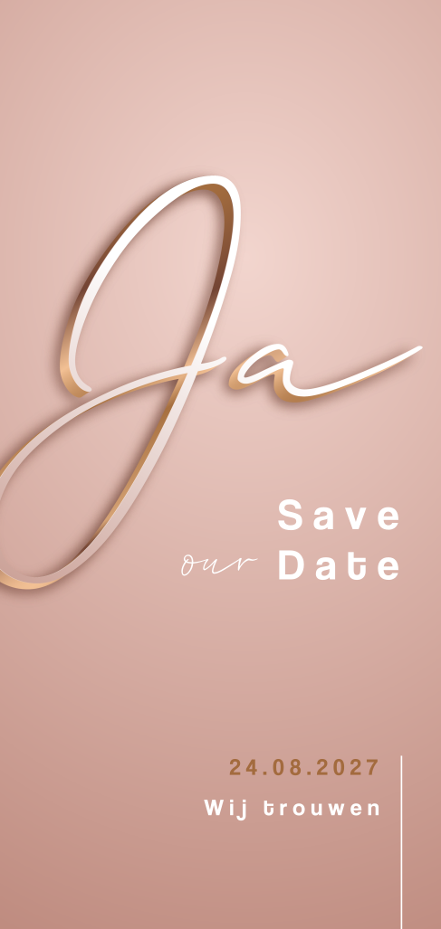 Bijpassende save the date kaart in oudroze met 'Ja' en een hartje in reliëf stijl. De tekst is in bijpassend wit en bruin in trendy lettertypes, in de online editor maak je de kaart persoonlijk en naar eigen wens klaar om te versturen.