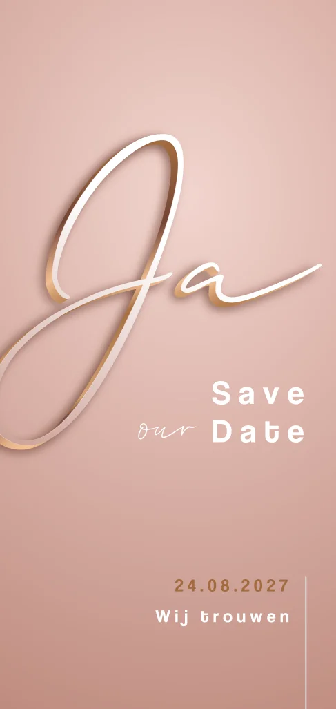 Bijpassende save the date kaart in oudroze met 'Ja' en een hartje in reliëf stijl. De tekst is in bijpassend wit en bruin in trendy lettertypes, in de online editor maak je de kaart persoonlijk en naar eigen wens klaar om te versturen.| Totaalprijs: 0 |