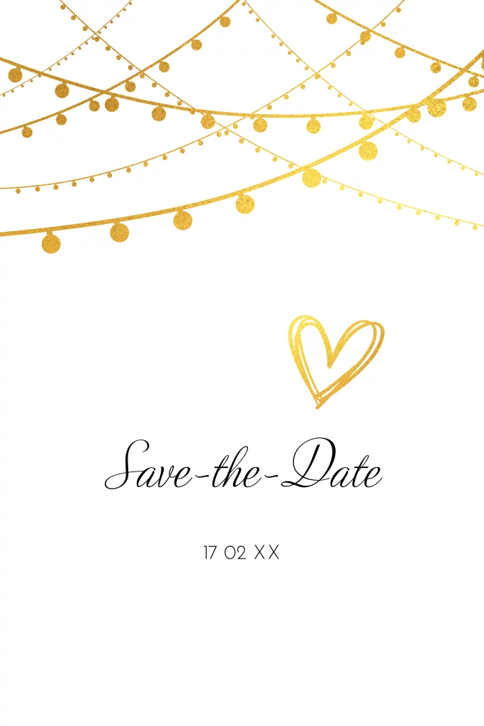 Een feestelijke save the date kaart met vrolijke goudkleurige lampjesslingers, je ziet meteen dat er een feest op stapel staat! Ook de romantische hartjes zijn goudkleurig, maak de kaart naar wens af. Liever andere kleur of lettertype? Je kunt het allemaal zelf aanpassen in de online editor en er een persoonlijke kaart van maken.