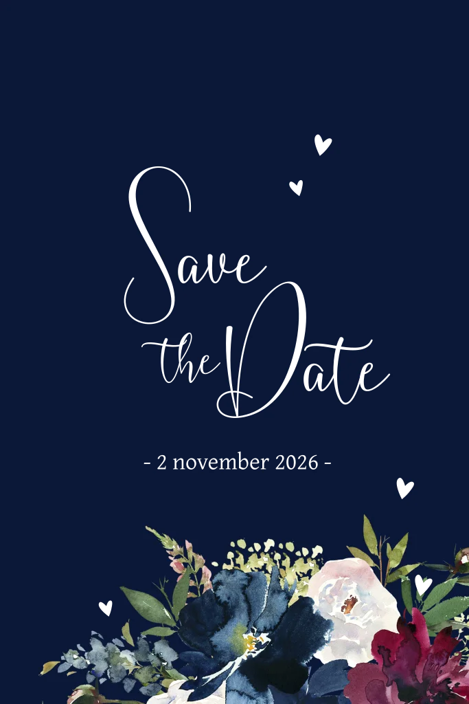 Stijlvolle donkerblauwe save the date kaart met boeket van bloemen, gecombineerd met tekst en enkele elementjes in goudfolie krijgt de kaart een chique uitstraling.