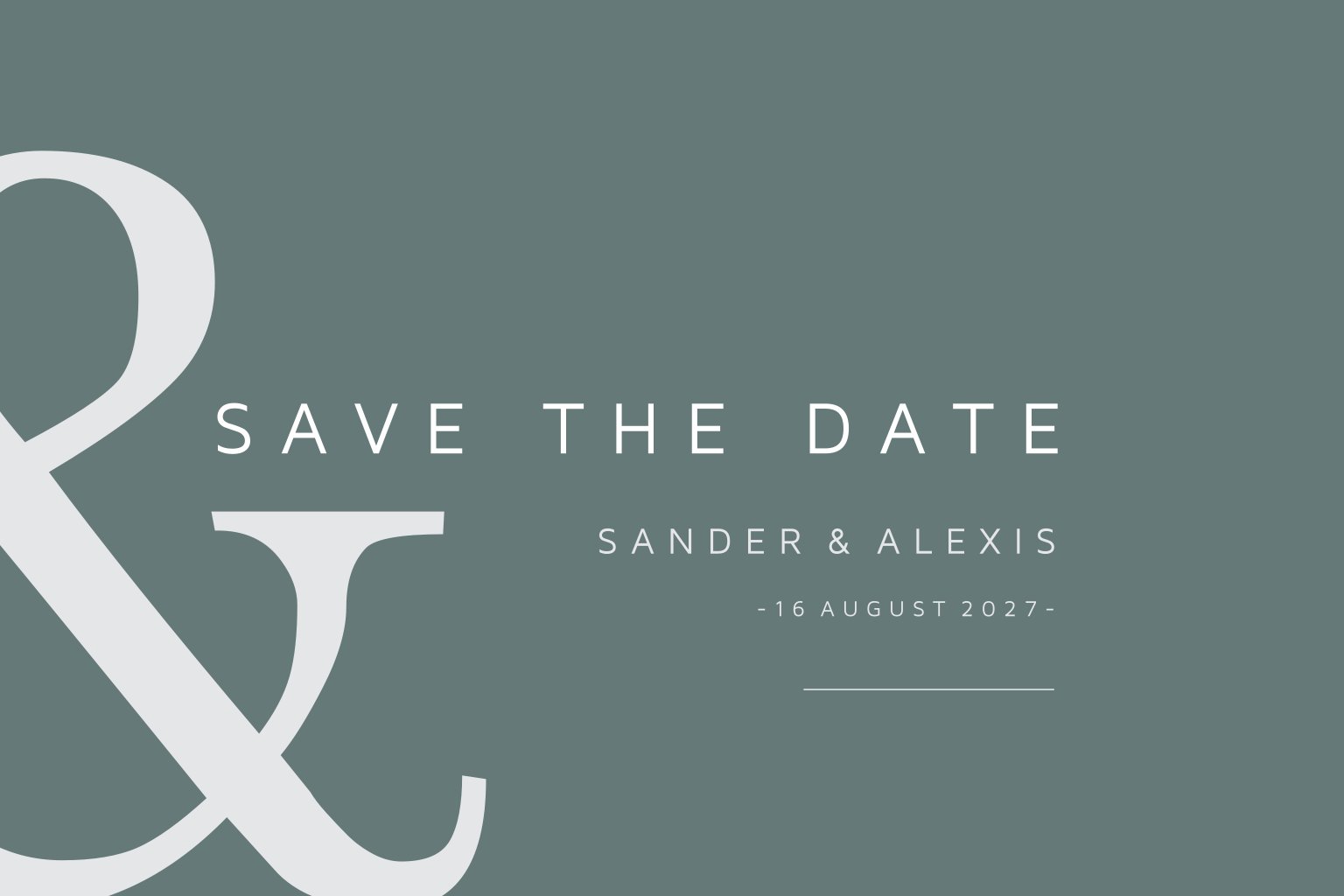 Een eenvoudige petrolkleurige save the date kaart, om jullie trouwdag aan te kondigen. De tekst is in wit en dubbelzijdig goudfolie, zowel op de voorkant als de achterkant wordt de tekst in goudfolie gedrukt. Ga naar de online editor en maak de kaart naar wens af.