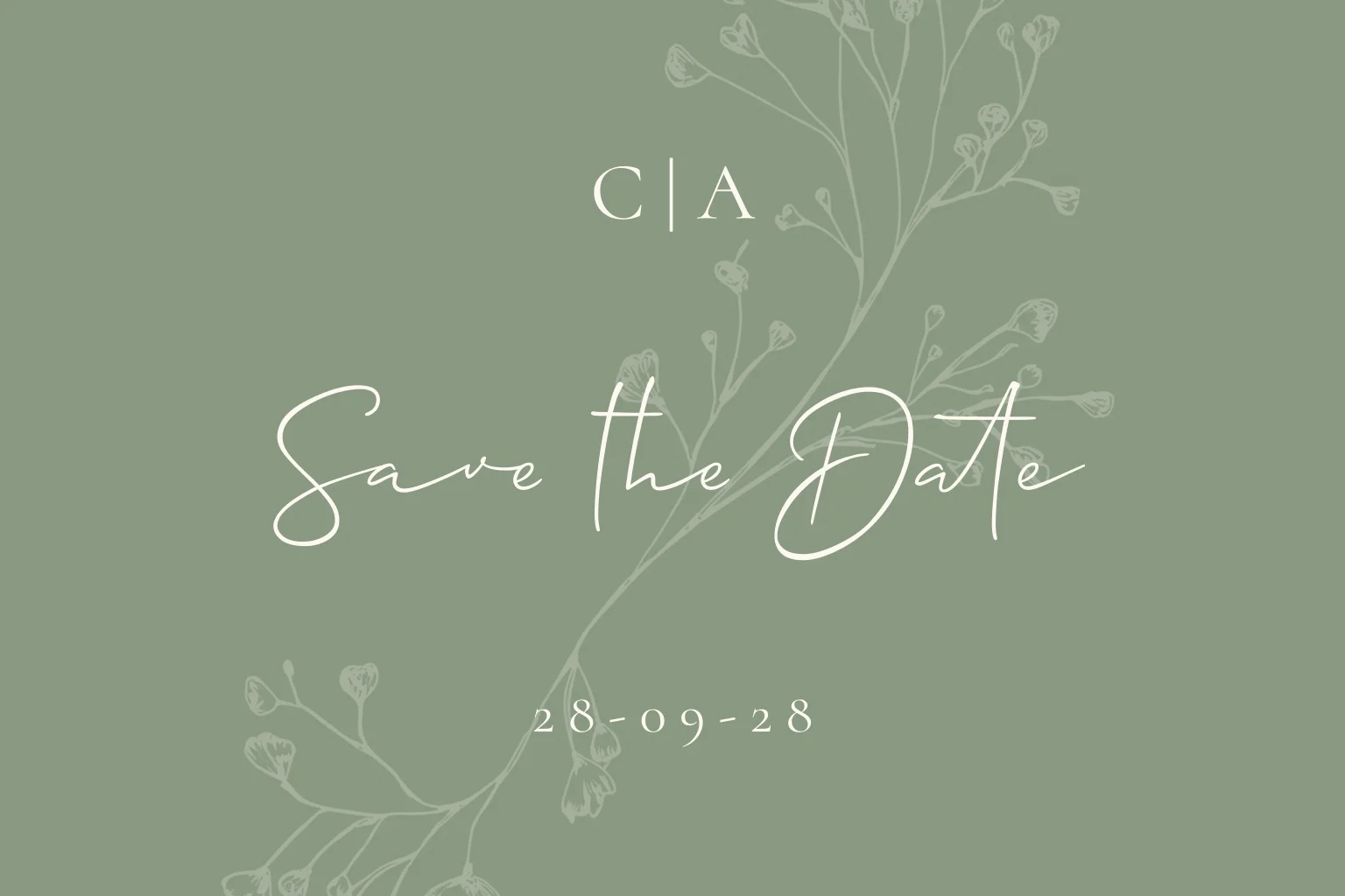 Save the date kaart met bloementjes op groene achtergrond.Plaats zelf de teksten en elementen eenvoudig op de juiste plek in onze opmaaktool. Heb je hier hulp bij nodig? Neem gerust even contact met ons op!