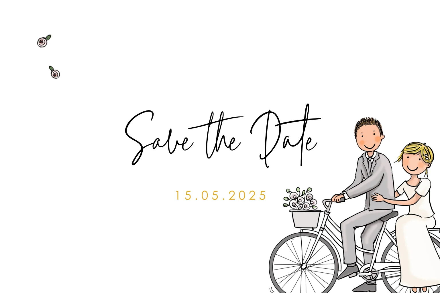 Laat vrienden en familie weten dat jullie gaan trouwen met deze vrolijke Save the Date kaart. De kaart een vrolijke cartoon van een bruidspaar op een fiets. Kijk ook naar de bijpassende trouwkaart, menukaart en bedankkaart in dezelfde stijl.