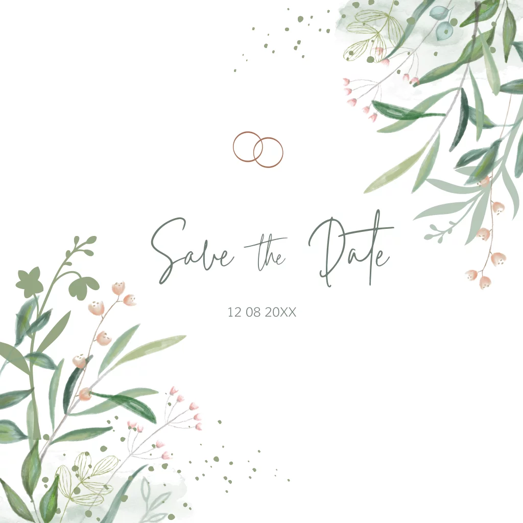 Prachtige en unieke Save the date kaart horende bij de botanische trouwkaart. Deze save-the-date- kaart heeft getekende bloemen en blaadjes in groene en roze tinten. In de editor kun je de tekst naar wens aanpassen.Bekijk de trouwkaartenset: