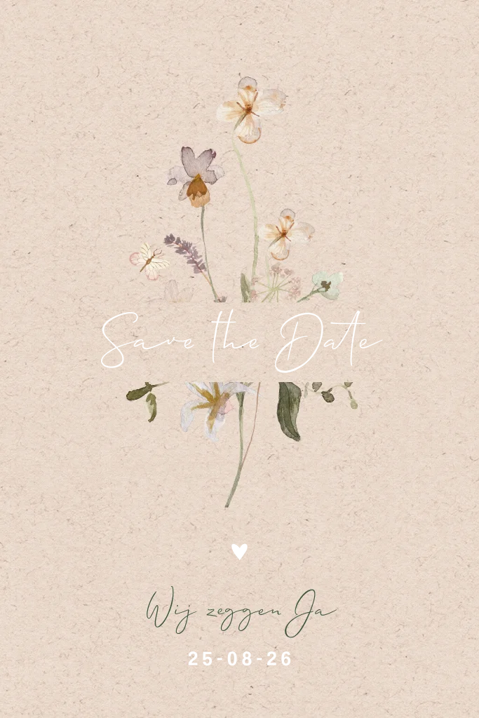 Mooie vintage save the date kaart in stijl van de oudroze trouwkaart. Een boeketje veldbloemen in zachte pastelkleuren siert de voorkant, de letters in goudfolie geven de kaart een extra luxe uitstraling. De bloemen staan ook in het klein op de achterzijde bij de tekst, pas deze eenvoudig zelf aan in de online editor.