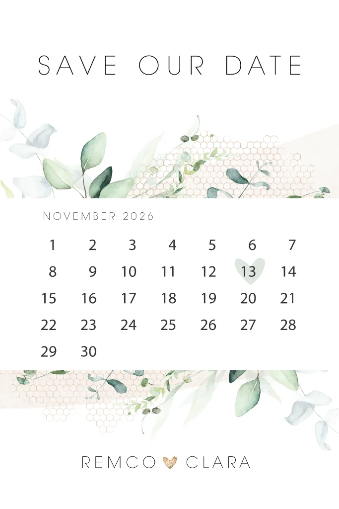 Een stijlvolle save the date kaart in dezelfde stijl als jullie trouwkaart, echt trendy! In het midden de kalendermaand met een hartje om jullie trouwdatum, dat valt meteen op. Op de achtergrond eucalyptustakjes op een zachtroze aquarelvlak. Jullie namen staan eronder in een modern lettertype, het kleine hartje ertussen maakt het helemaal compleet.
