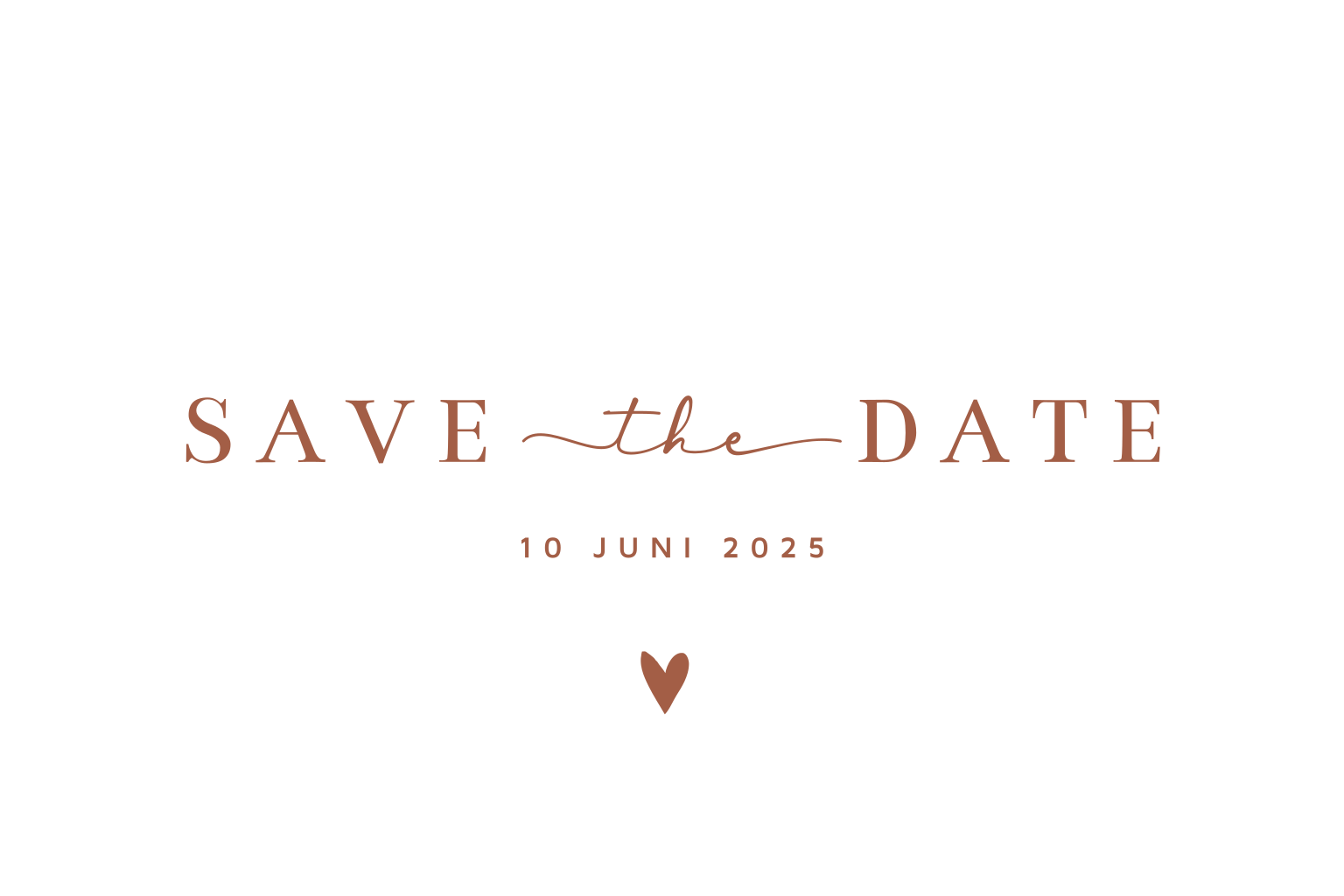 Hippe witte save the date kaart gecombineerd met tekst in roodbruin. Op de voorkant een hartje onder de datum, op de achterkant staat een mooie lijntekening van takjes. Maak de kaart naar wens af in de online editor en bestel een proefdruk.