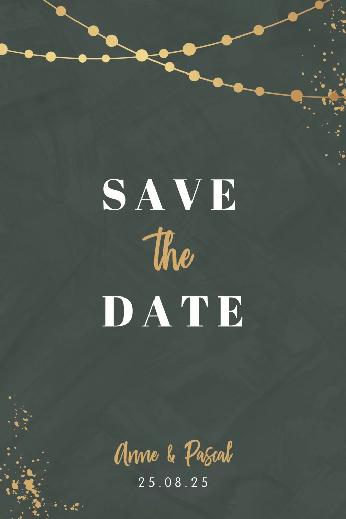 Chique save the date kaart in donkergroen met een lampjesslingers en confetti in goudkleur. De achterkant van de kaart is wit met trendy lettertypes in bijpassende kleuren, pas de kaart naar wens aan in de online editor.| Totaalprijs: 0 |
