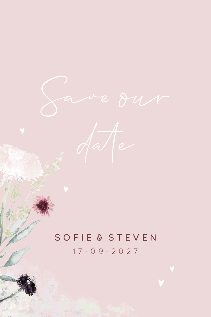 Een romantische save the date kaart met waterverf bloemen en rosegoudfolie, perfect voor een chique bruiloft. De kleine hartjes maken het compleet, love is in the air! De achterkant van de kaart is wit, hier komen het design en de kleuren ook weer terug.| Totaalprijs: 0 |