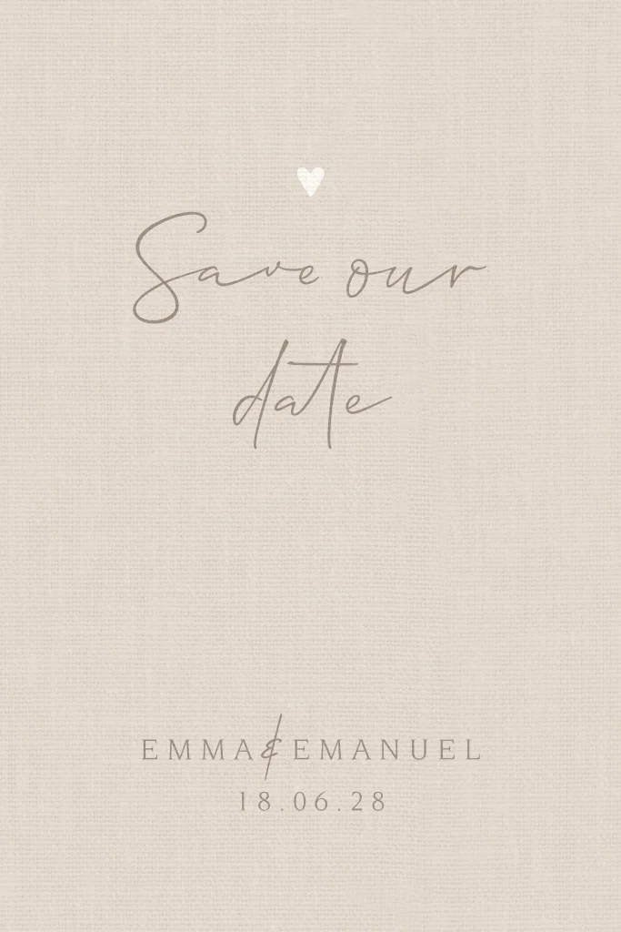 Elegante save the date kaart in zacht beige nude kleur. Een simpel maar chic ontwerp met sierlijk lettertype en een klein hartje onder de tekst.