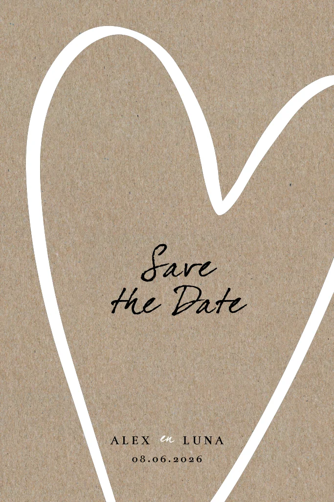 Stoere save the date kaart op echt kraft met witte hart