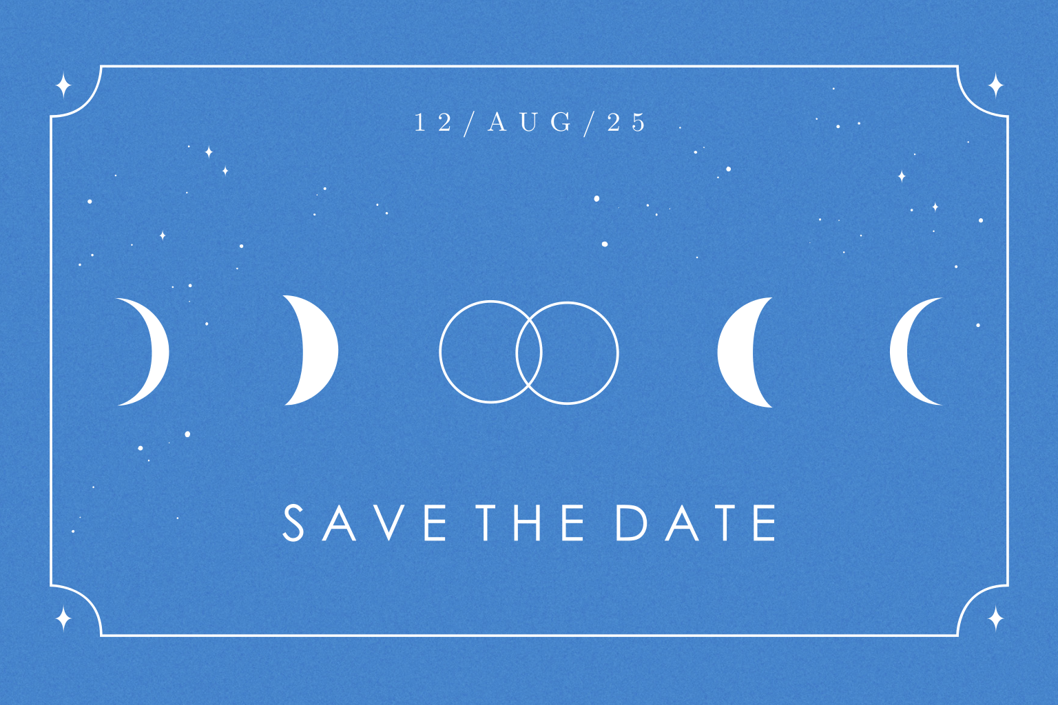Kobaltblauwe save the date kaart in tarot stijl met sterren en maantjes. De lijn langs de rand, de ringen en sterren zijn in goudfoliedruk. Op de achterkant staat een wit kader, hier is ruimte voor de tekst, pas deze zelf aan in de online editor.