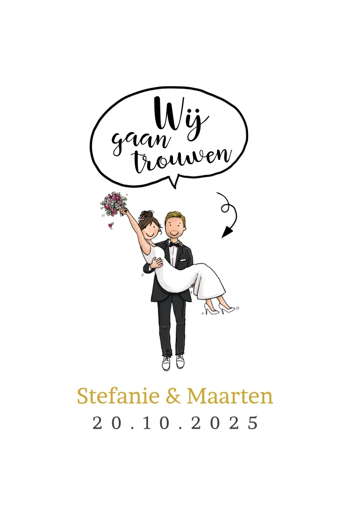 Originele save the date om je huwelijk alvast aan te kondigen, met een vrolijke illustratie van een bruidegom die zijn bruid draagt. Verplaats de cirkel naar jullie trouwdatum en verstuur deze save the date kaart! Wist je dat we een bijpassende trouwkaart aanbieden?