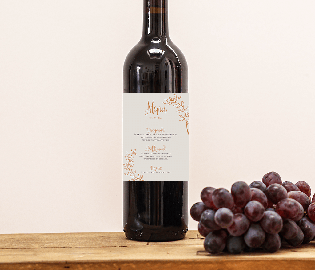 Etiket met menu op wijnfles met takjes
