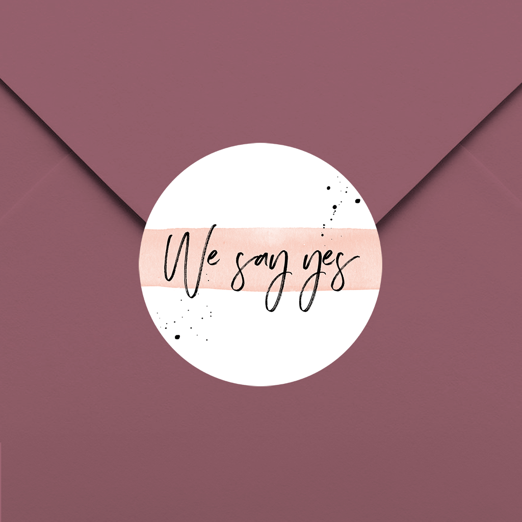 Deze sticker past perfect bij de hippe trouwkaart met het roze waterverf vlak. Op het roze vlak staat 'we say yes' in trendy letters en daar omheen zwarte verfspetters.