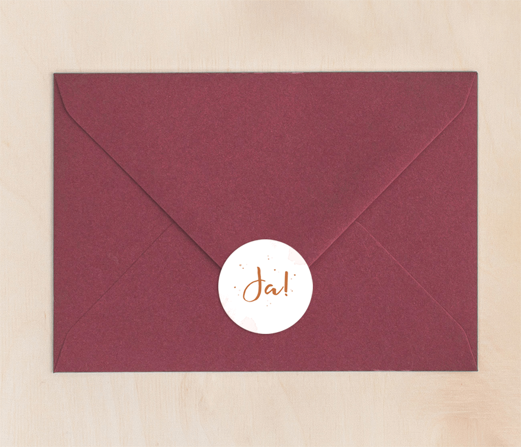 Met een bijpassende sticker bij jullie trouwkaart maak je de uitnodiging compleet en sluit je de enveloppen ook nog eens op een snelle manier, echt handig! Op de achtergrond staan zachtroze waterverfvlekken, in het midden 'Ja!' in koperkleur en op de achtergrond spetters en hartjes in dezelfde kleur.