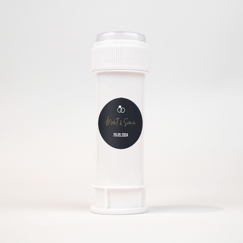 Deze sticker past perfect bij de trouwkaart met de verschillende icoontjes. Op de zwarte achtergrond komen de trouwringen en de trouwdatum goed naar voren. De namen staan in goudgele hippe typografie in het midden, dat valt meteen op als je de enveloppe uit de brievenbus haalt!