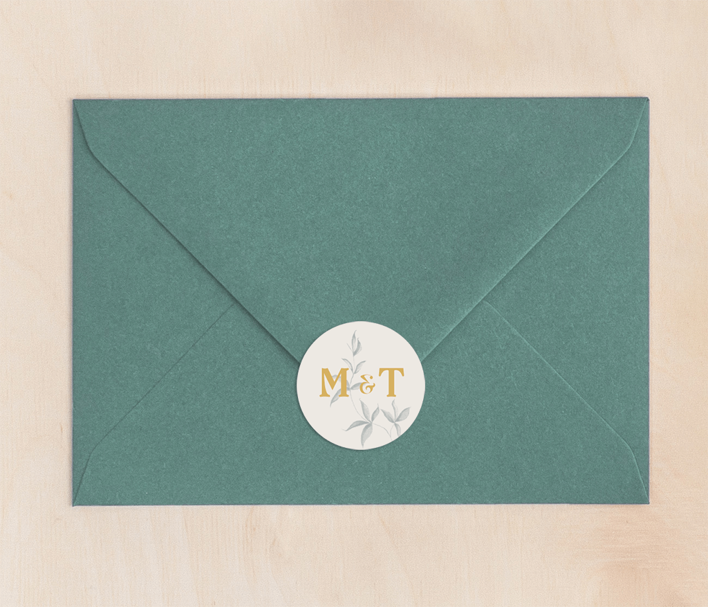 Een mooie sluitsticker met de initialen van jullie namen en een takje op de achtergrond. Deze sticker maakt de uitnodiging voor jullie bruiloft helemaal af. Deze sluitzegel hoort bij de twee-delige trouwkaart met een waterverf tak.