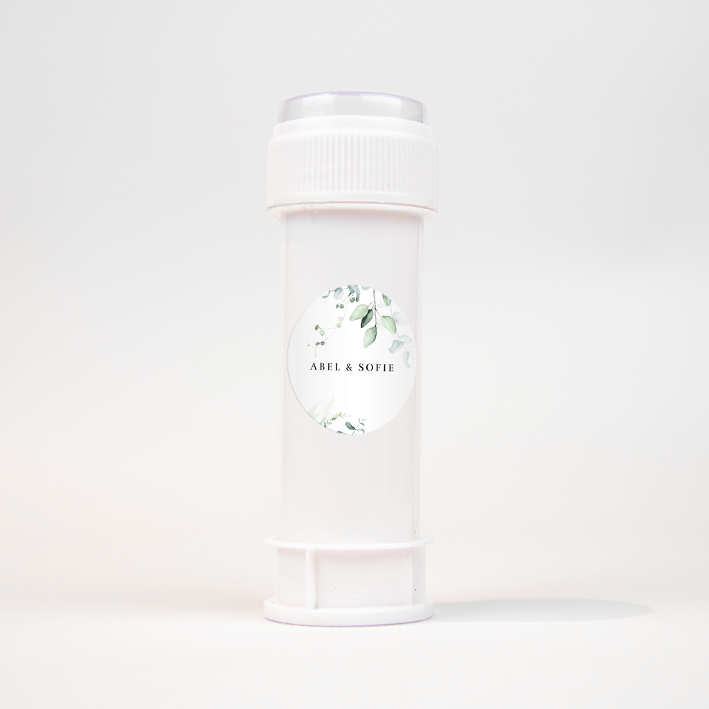 Deze sticker past mooi op de donkergroene enveloppe waarin je de houten trouwkaart verstuurt, dat trekt meteen de aandacht! De namen van het bruidspaar staan centraal op de sticker, langs de rand de mooi getekende eucalyptustakken met blaadjes in verschillende grootte.
