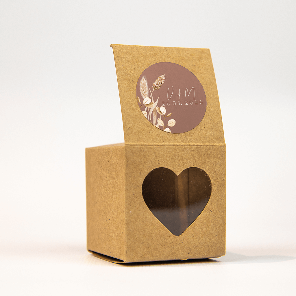 Dat wordt een echte eyecatcher op de enveloppe, deze bijpassende sticker in roestbruin met droogbloemen. Naast het droogboeket in pastelkleuren staan de initialen van het bruidspaar en de trouwdatum in mooie typografie, echt trendy!