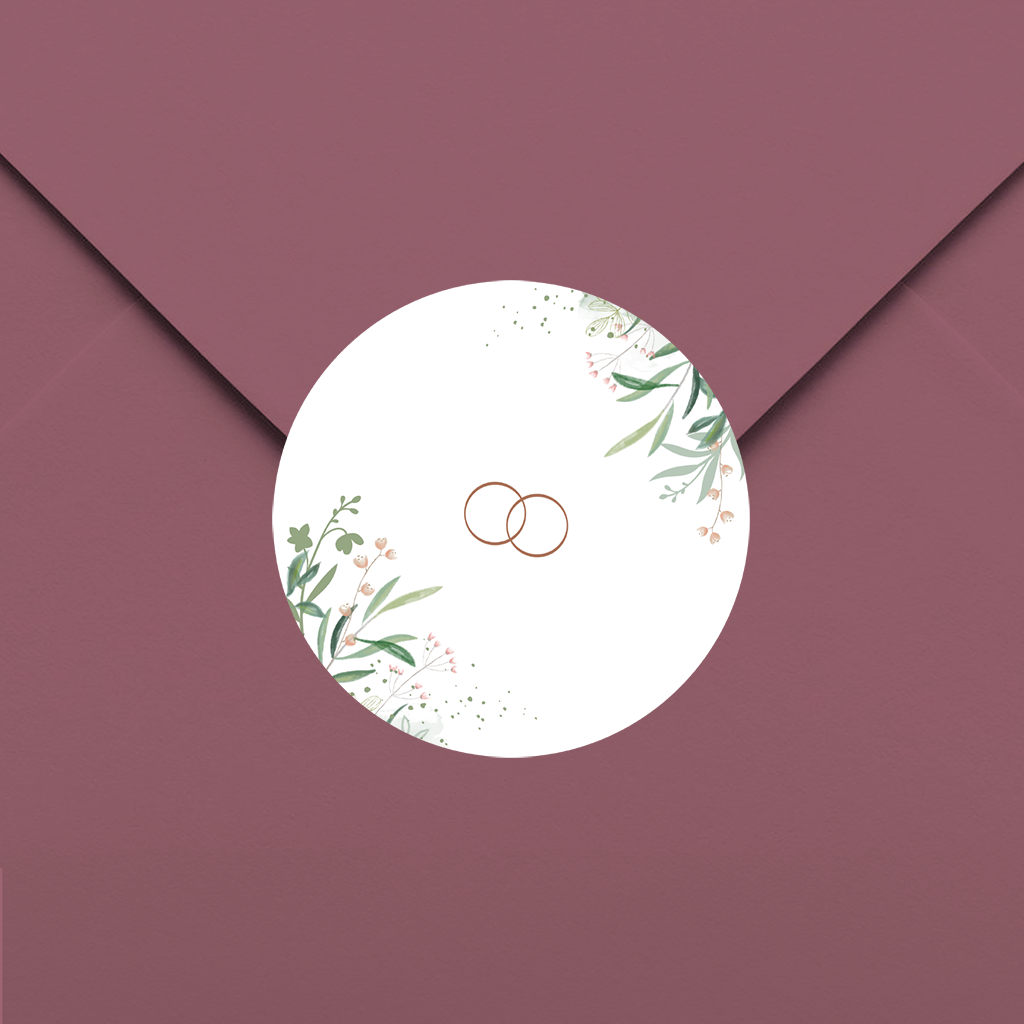 Botanische sticker die perfect past bij de houten huwelijksuitnodiging. Langs de rand staan mooi getekende takjes met bloemen en kleine spetters er omheen. In het midden twee in elkaar gevlochten trouwringen, mooie sticker op de donkergroene enveloppe!