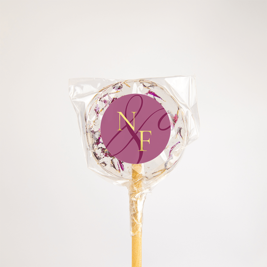 Sticker goudfolie met initialen op donkerfuschia - vel van 25 stickers, afmeting 35mm ø.