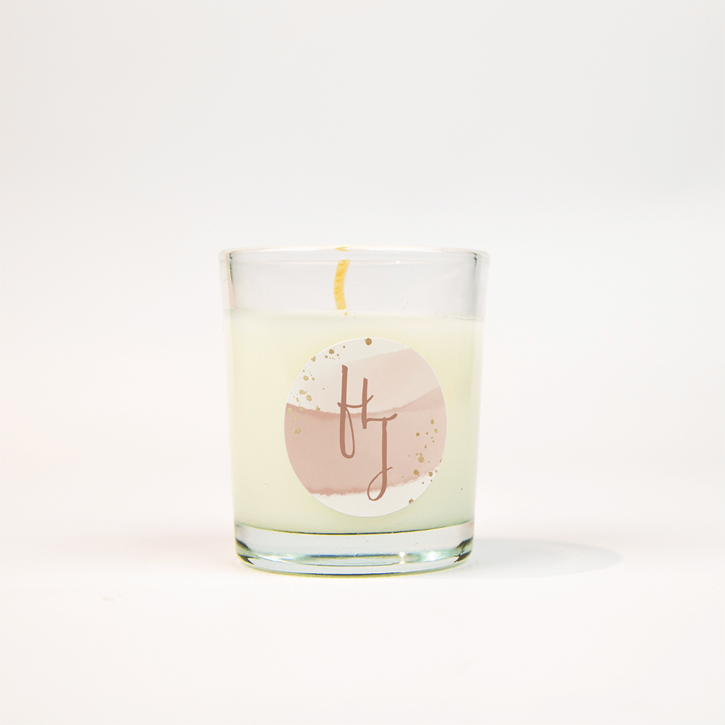 Sticker met initialen, verschillende tinten roze waterverf en gouden verfspetters - per vel van 25 stuks.