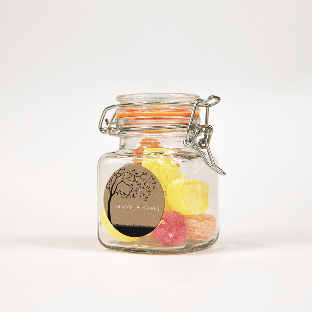 Trendy, deze sticker in kraftlook bij jullie huwelijksuitnodiging! Langs de rand het zwarte silhouet van een boom in een landschap. De namen van het bruidspaar en de romantische hartjes zorgen voor een mooi contrast.