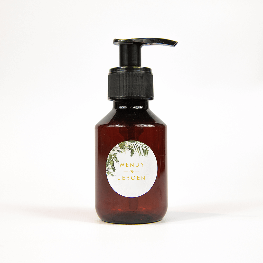Botanische sticker bijpassend bij de trouwkaart met orchidee en geometrische lijnen. De namen staan in strakke typografie centraal op de sticker, erboven mooie groene takken met een orchidee, stijlvolle sticker om de enveloppen mee te sluiten!