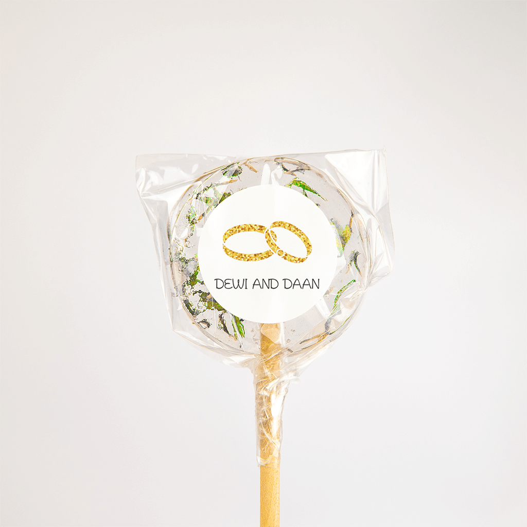 Bijpassende sticker bij de hippe trouwkaart met grappige tekst. Op de witte sticker de namen van het bruidspaar in moderne typografie en twee gouden trouwringen erboven, mooi contrast op een gouden enveloppe!