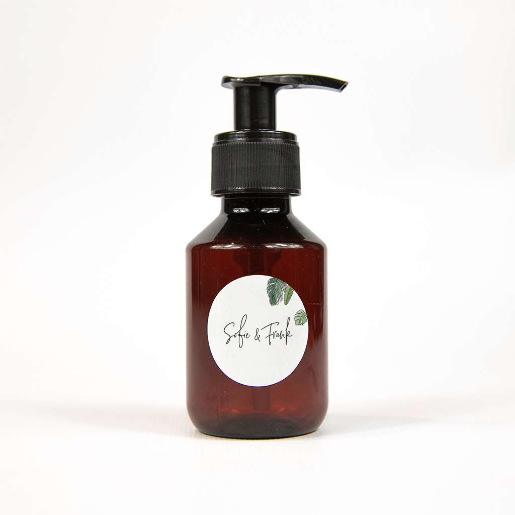 Trouwsticker met de namen van het bruidspaar centraal in sierlijk lettertype. Erboven een illustratie van groene bladeren.