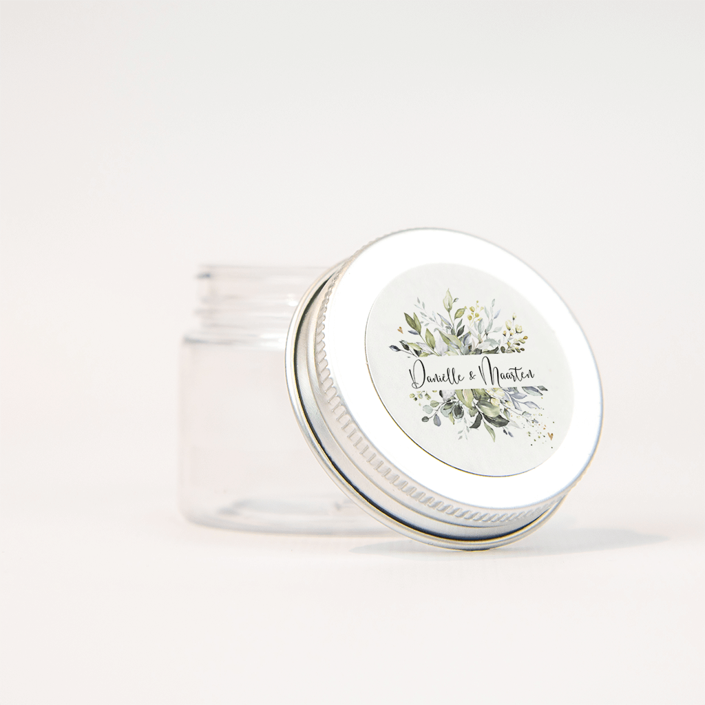 Met zo'n sticker op de enveloppe van jullie huwelijksuitnodiging trek je meteen alle aandacht! De namen staan in trendy letters in het midden met een mooie aquarel van takjes er omheen.