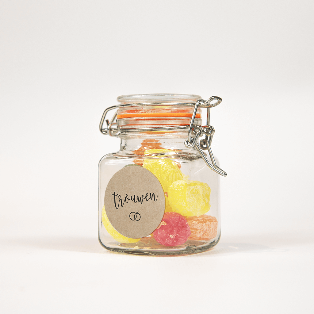 Bijpassende sticker bij de hippe trouwkaart in kraft. In vrij geschreven letters staat 'trouwen' en eronder twee trouwringen. Plak de enveloppen hiermee dicht en zodra deze uit de brievenbus worden gehaald is duidelijk dat er een huwelijksfeest aan zit te komen!