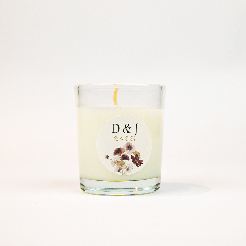 Bijpassende sticker bij de trouwkaart in boogvorm met bloemen. De initialen van het bruidspaar staan bovenaan, eronder de trouwdatum en een mooi boeket bloemen in rood en oranje tinten. Een stijlvolle sticker om jullie trouwkaart compleet te maken!