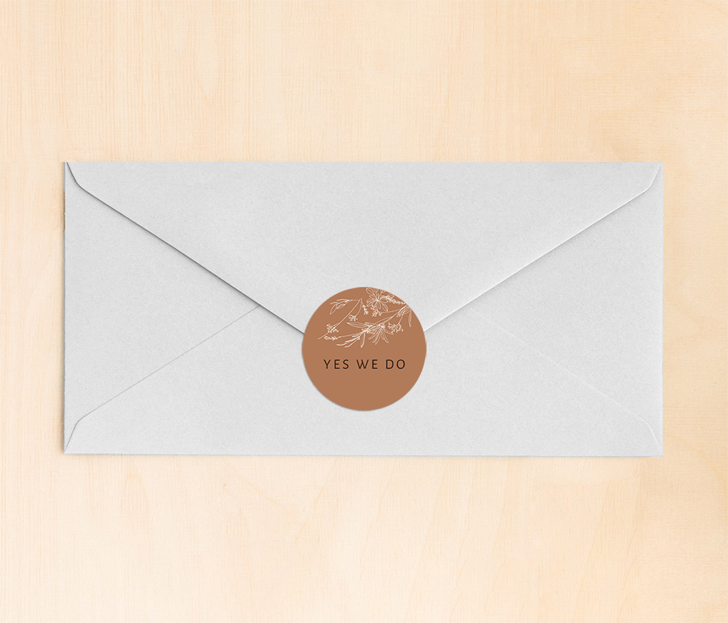 Een stijlvolle bijpassende sticker bij de chique roestbruine huwelijksuitnodiging. De mooi getekende witte takjes komen mooi naar voren op de bruine achtergrond, eronder 'yes we do' in strakke moderne zwarte typografie. Natuurlijk kun je hier ook een andere tekst plaatsen, zo zelf aangepast in de online editor!