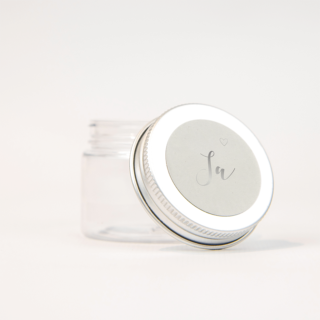 Grijze sticker met een klein getekend hartje. In het midden staat 'ja' in zilverfoliedruk.