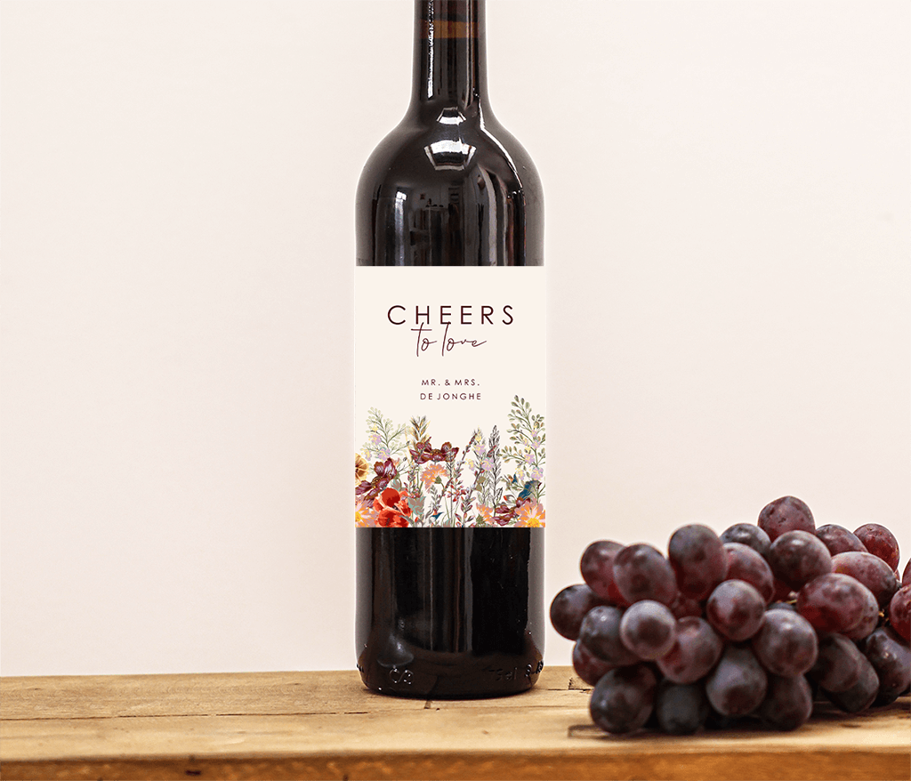 Wil je gepersonaliseerde flessen op je bruiloft? Ontwerp je eigen stickers en verras je bruiloftsgasten met gepersonaliseerde wijn-, champagne- of bierflessen! Dit pastelkleurige exemplaar is helemaal in de stijl van de trouwkaart met een mooie rand van kleurrijke veldbloemen onderaan en de tekst in bijpassende kleur.