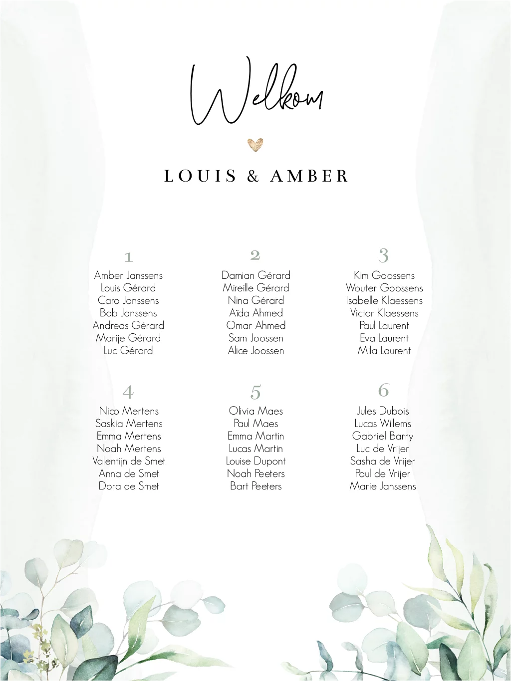 Stijlvolle poster met eucalyptustakjes op aquarel en een goudkleurig hartje boven de namen van het bruidspaar. De posters worden gedrukt op stevig, glad papier (Silk MC 250 g/m²). De poster kan niet op zichzelf staan, maar moet worden ingelijst of bevestigd met bijvoorbeeld plakband.