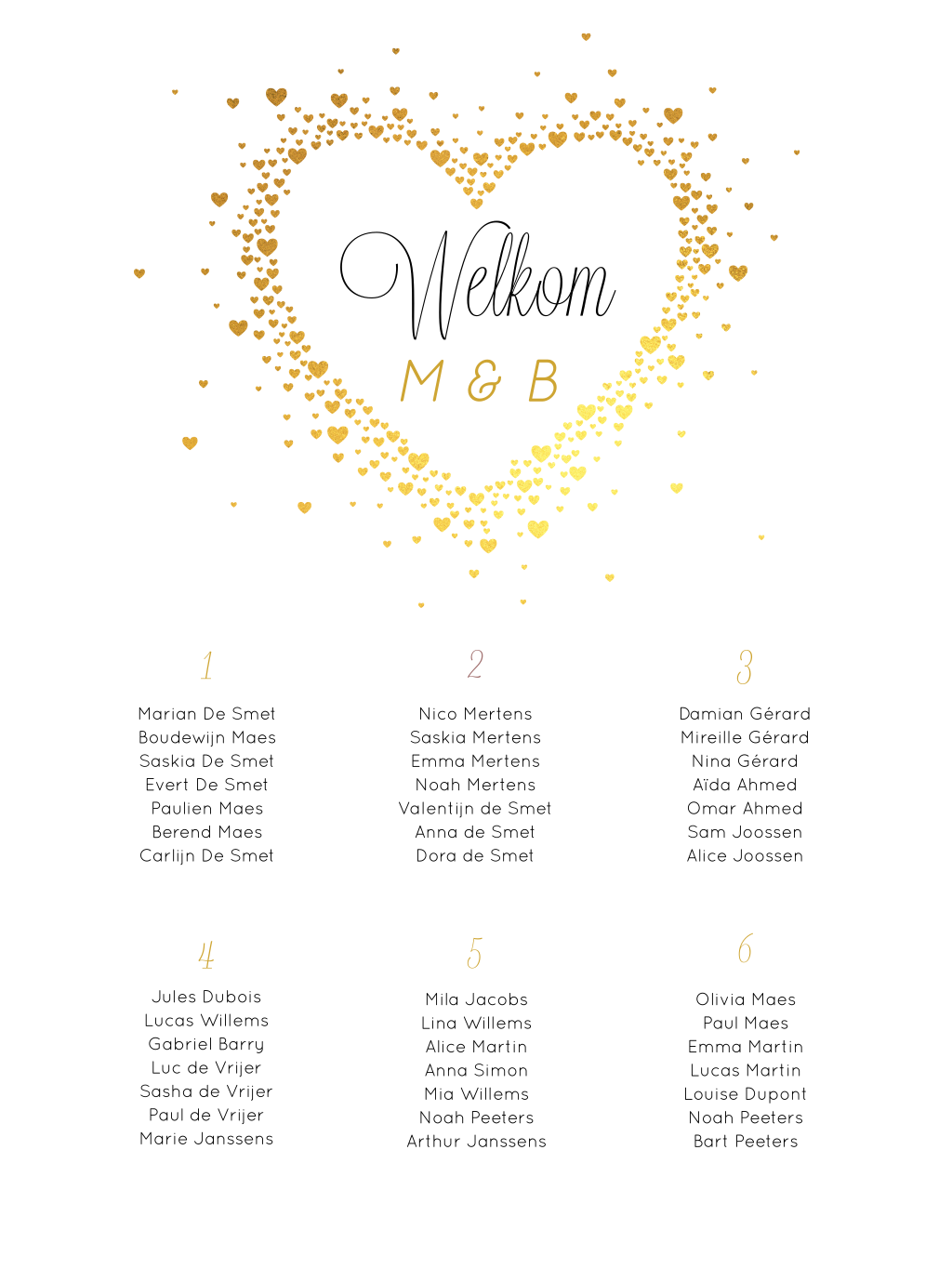 Witte poster met hart van gouden hartjes voor de tafelschikking, met welkom en de initialen van het bruidspaar erin. De posters worden gedrukt op stevig, glad papier (Silk MC 250 g/m²). De poster kan niet op zichzelf staan, maar moet worden ingelijst of bevestigd met bijvoorbeeld plakband.