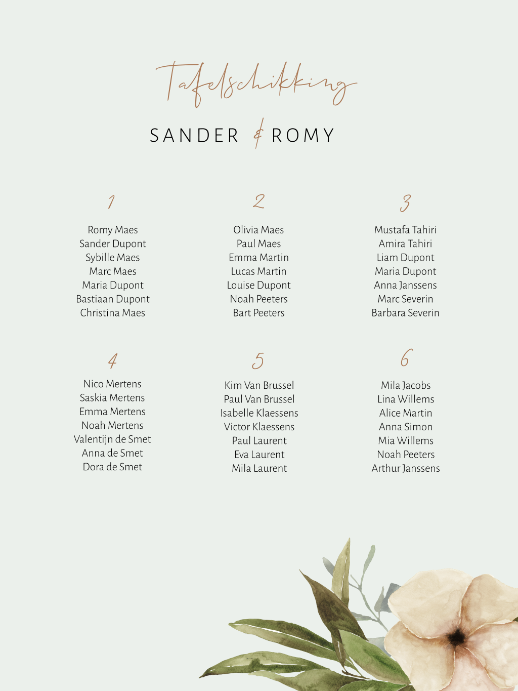 Stijlvolle poster met tafelschikking voor het trouwdiner, in de stijl van de trouwkaart met een grote witte bloem op een zacht blauwgrijze ondergrond. De posters worden gedrukt op stevig, glad papier (Silk MC 250 g/m²). De poster kan niet op zichzelf staan, maar moet worden ingelijst of bevestigd met bijvoorbeeld plakband.